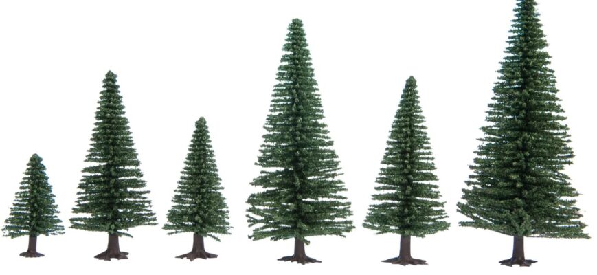 The “Model Fir Trees” set comes with 10 hand-colored fir trees, which are ideal for the realistic design of model landscapes. The trees vary in height between 5 cm and 14 cm and are therefore perfect for recreating forest scenes in H0 (1:87) and TT scale (1:120). Each tree has a lifelike trunk and is provided with a special flock of needles to ensure an authentic coniferous appearance. You can also create perfectly realistic and lively forests, forest edges or individual groups of trees on your model railway layout.