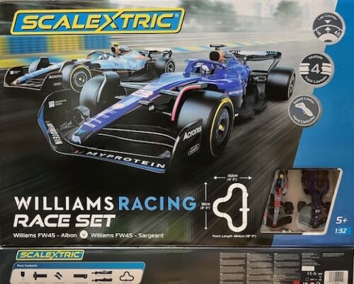 2x Slot Cars (Williams FW45), 2x Hand Controllers, 1x 584mm Straight Track, 1x 584mm Powerbase Track, 4x Radius 2 45º Curved Track, 6x Radius 2 90º Curved Track, 1x 15v EU Wall Adaptor, 2x Track Supports, 4x Spare Guide Blades, 1x Instructions